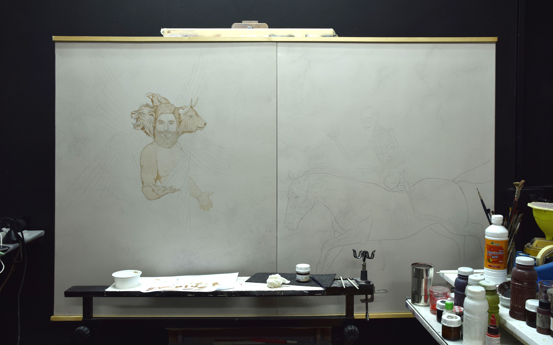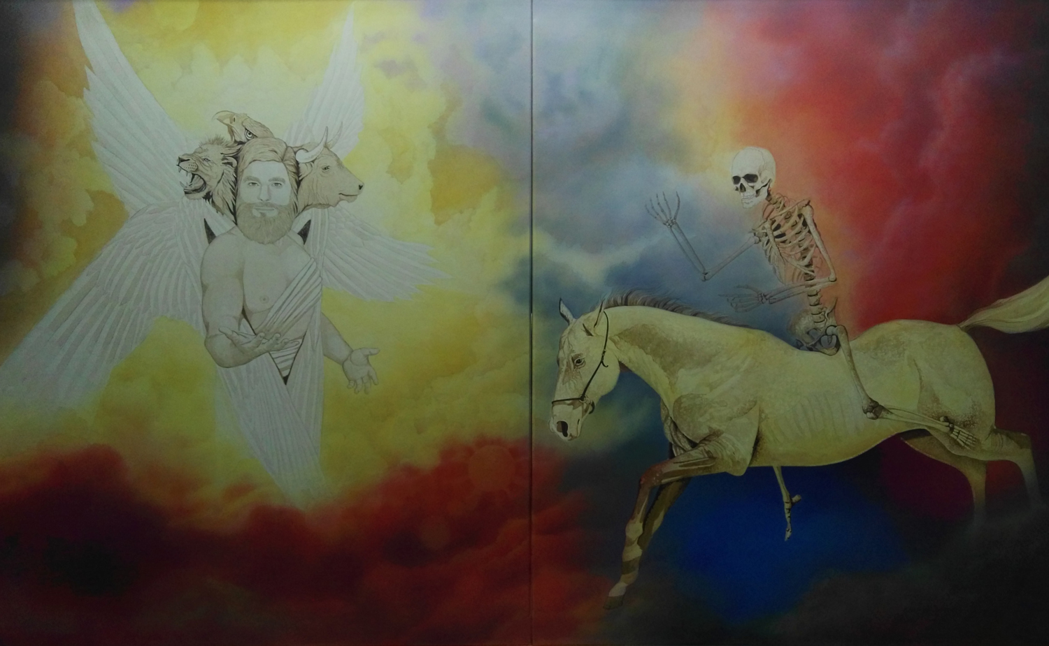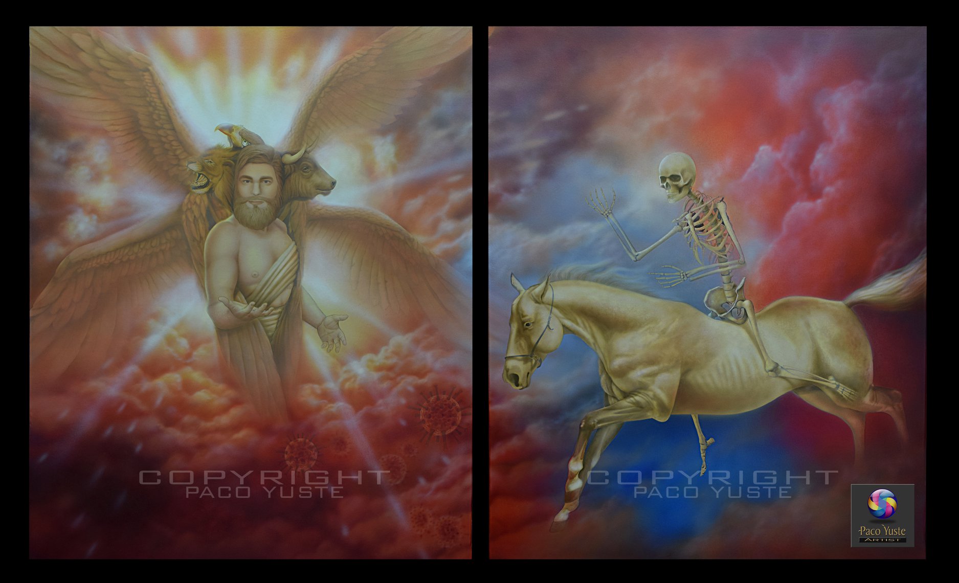 Es una obra basada en una visión profética del libro bíblico Apocalipsis. Esta visión se encuentra en el capítulo 6 versículos 7 y 8. Se compone de dos piezas de 100 x 81 cm cada una sobre lienzos preparados con gesso para crear una superficie lisa y pintadas con la técnica mixta de óleo sobre acrílico. Es decir: una vez preparados los lienzos se procede a pintar la pintura de base, la pintura intermedia y la pintura avanzada con acrílicos y se termina totalmente al óleo en las fases finales. Finalmente se aplica un barniz final satinado para proteger la obra.