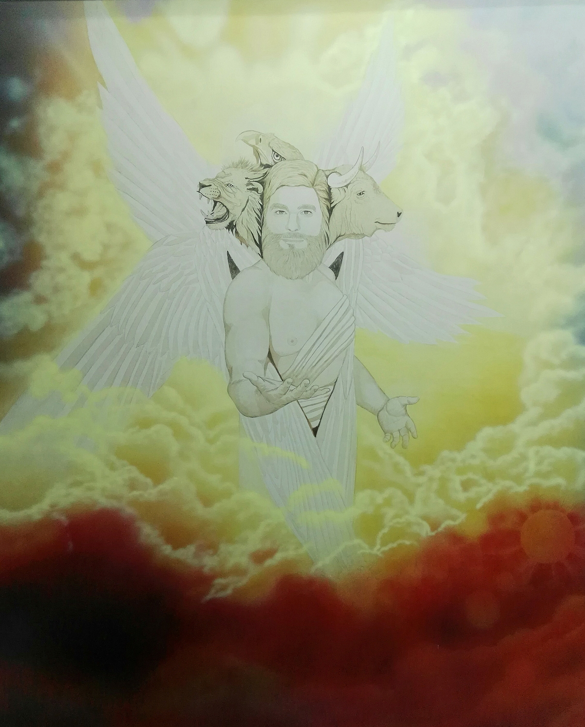 Paso 5 – Pintura avanzada con acrílicos. En este paso se trata de seguir avanzando en los detalles primero del fondo y después de los personajes, trabajando desde los planos lejanos hacia los primeros planos. En esta fase he trabajado los detalles de las nubes con un aerógrafo Paasche con boquilla 0,2. He pintado las zonas en sombra aplicando el principio que explico en mi teoría del color. En los personajes he ido alternando el rociado con aerógrafo con la aplicación con pincel fino para los detalles. Para suavizar y fundir los tonos que he aplicado a pincel he rociado nuevamente color con aerógrafo con colores semi-cubrientes, seguido de nuevas capas con colores transparentes. He realizado en esta fase algunos cambios en las alas del querubín para darle más grandiosidad, propio de una figura angelical.