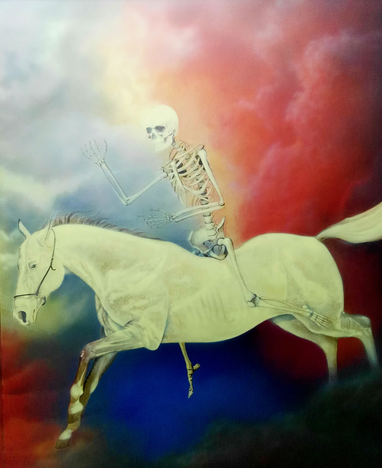 Dice: 7 “Cuando el Cordero abrió el cuarto sello, oí la voz del cuarto ser viviente decir: “¡Adelante!”. 8 Y vi entonces un caballo pálido. Su jinete se llamaba Muerte, y la Tumba lo seguía de cerca. Y se les dio autoridad sobre la cuarta parte de la tierra para matar con una espada larga, con hambre, con una plaga mortal y con los animales salvajes de la tierra”. Tuve la idea de crear esta obra pensando en los tiempos de crisis sanitaria e incertidumbre que estamos viviendo. Y con el propósito de dar una interpretación y una esperanza para el futuro.